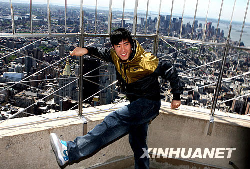 5月28日,在美國紐約帝國大廈86層觀景平臺,劉翔擺出姿勢供媒體拍攝。
