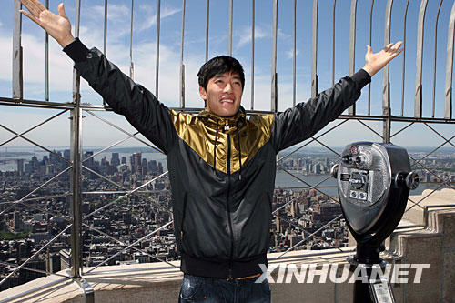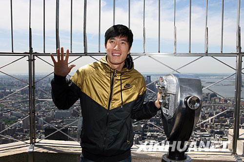 5月28日,在美國紐約帝國大廈86層觀景平臺,劉翔擺出跨欄姿勢供媒體拍攝。當(dāng)日,劉翔在紐約出席田徑大獎(jiǎng)賽記者見面會。第四屆銳步田徑大獎(jiǎng)賽將于5月31日在紐約舉行。