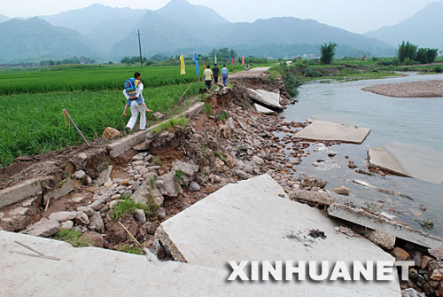 6月2日,在仙回瑤族鄉(xiāng)古盤村,村民小心通過(guò)被洪水沖毀的道路。 |