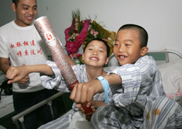 5月30日,11歲的張浩(中)與9歲的尹培(右)在病房里手持“祥云”火炬,興奮地喊:“四川加油!”看到孩子們很開心,奧運火炬手賀剛十分欣慰。