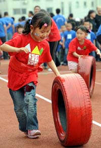 6月1日,孩子們在賽場上滾輪胎。當日,南京市實驗幼兒園及其三所分園在南京五臺山體育場舉行“迎奧運,慶六一”親子運動會,近1500名小朋友和他們的家長走上賽場,參加15項趣味體育項目的比賽和健身操展演,表達對北京奧運會的期盼。