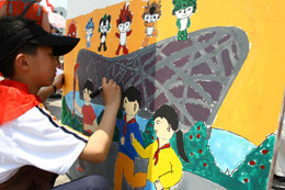 一名小學生在阜陽市清河廣場參加壁畫比賽。安徽阜陽市迎奧運暨抗震救災少年兒童壁畫大賽日前在清河廣場舉行。