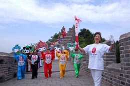 天津銀光中老年服裝服飾表演團成員在金山嶺長城展示各民族服飾和帶有奧運元素的服飾。