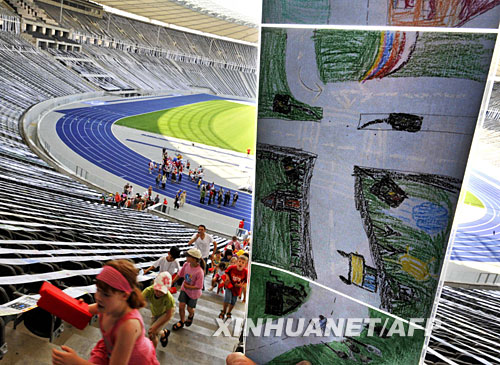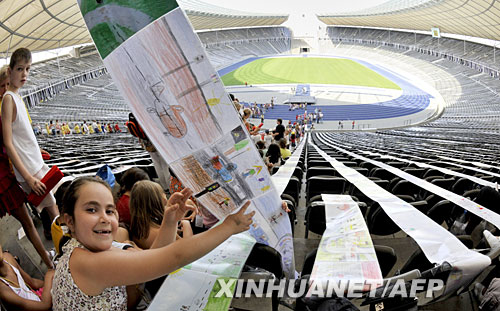 6月3日,在德國首都柏林的奧林匹克體育場,孩子們從長達(dá)3.7萬米的畫卷旁走過。新華社/法新