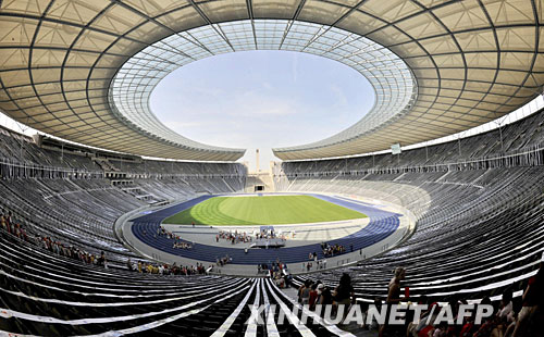 6月3日,在德國首都柏林的奧林匹克體育場,長達(dá)3.7萬米的畫卷覆蓋了所有的座位。新華社/法新