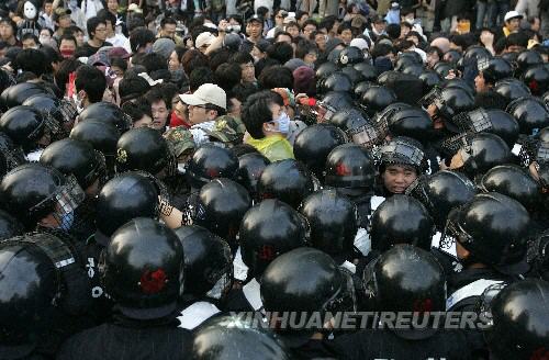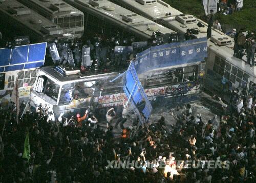 雖然韓國總統(tǒng)李明博7日晚與美國總統(tǒng)布什就牛肉貿(mào)易問題通電話,但韓國民眾反對(duì)恢復(fù)進(jìn)口美國牛肉的示威游行仍未停止。新華社/路透