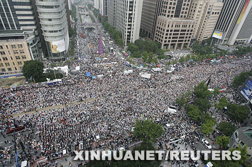 因擔憂進口美國牛肉可能給韓國帶來瘋牛病隱患,約100萬韓國人當天走上街頭參加抗議。韓國今年4月與美國達成開放市場進口美國牛肉協(xié)議,但遭到國內(nèi)強烈反對,引發(fā)一系列抗議活動。 新華社/路透