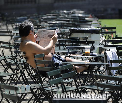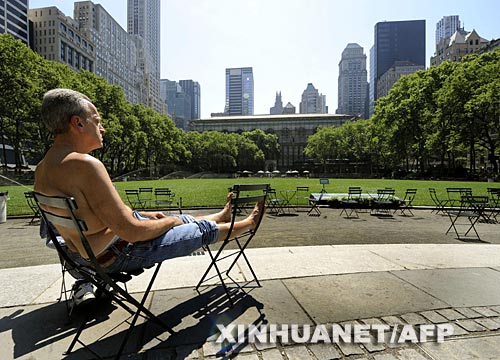 6月9日,在美國紐約布賴恩特公園,一名男子赤裸上身坐在曬得滾燙的椅子上。新華社/法新