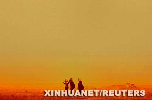 2003年4月16日,在伊拉克第二大城市巴士拉市郊,幾名伊拉克婦女頭頂水罐在沙塵暴中艱難前進(jìn)。