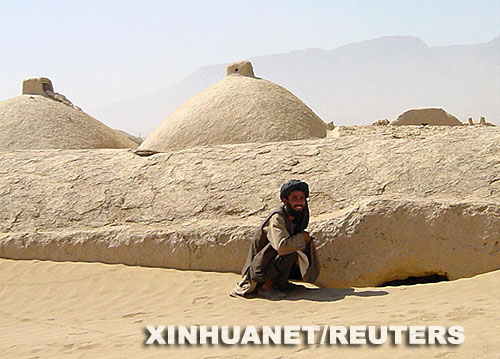2002年8月11日,在馬扎里沙里夫附近的一個(gè)村莊,一名阿富汗男子守在幾乎被沙子埋沒的家門口(右側(cè)可見)旁。 新華社/路透 |