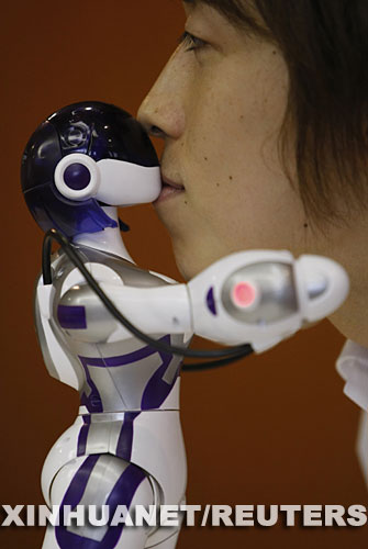 6月16日,日本世嘉玩具公司推出的新型機(jī)器人在東京舉行的展示活動上親吻一名男士。新華社/路透