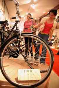 6月21日,觀眾在參觀展出的中國產(chǎn)飛鴿牌自行車。當(dāng)日,為迎接北京奧運會,即將于今年10月建成的河北霸州自行車博物館啟動了迎奧運先期預(yù)展活動。
