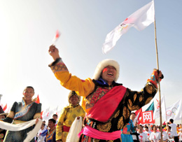 6月22日,蒙古族群眾在慶祝圣火傳遞。當(dāng)日,北京奧運會圣火在青海省格爾木傳遞。
