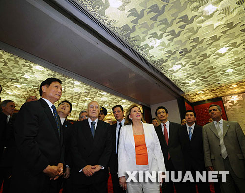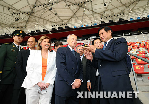 6月24日,正在中國進行國事訪問的希臘總統(tǒng)帕普利亞斯在中共中央政治局委員、北京市委書記、北京奧組委主席劉淇的陪同下參觀國家體育場——“鳥巢”。
