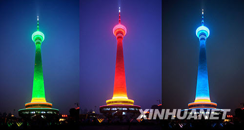 當晚,位于北京的中央電視塔在夜景燈光改造工程完畢后首次亮燈。中央電視塔夜景燈光以“燈籠”造型為主體,將在奧運會及國慶節(jié)、春節(jié)、中秋節(jié)等重要節(jié)日和重大慶典期間進行主題燈光展示,塔身不斷變化的彩色圖案呈現(xiàn)不同的主題內(nèi)容。新華社發(fā)