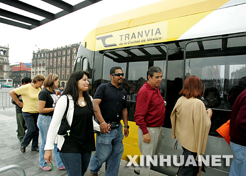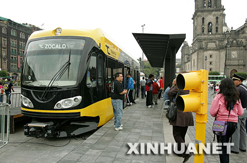 7月5日,墨西哥城聯(lián)邦區(qū)政府在墨西哥城索卡洛廣場(chǎng)展示將于2010年投入運(yùn)營(yíng)的新型有軌電車,同時(shí)征求市民意見(jiàn)。這種電車可載客300名。