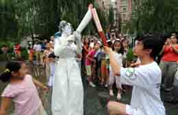 7月5日,一名扮演希臘女祭祀的少女“點燃”北京奧運火炬手高銘華(右)手中的火炬。
