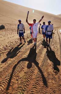 7月5日,火炬手劉巖手持火炬進行傳遞。當日,北京奧運圣火在甘肅敦煌傳遞。