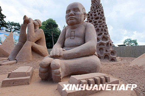 7月20日,拉脫維亞舉行國際沙雕節(jié)。這是拉脫維亞一名藝術(shù)家在沙雕節(jié)上創(chuàng)作的沙雕作品,名曰“小機器人制作微芯片沙餅”。 新華社/法新
