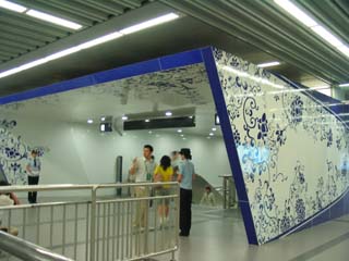奧運支線共設(shè)四個站點,分別為北土城站、奧體中心站、奧林匹克公園站和森林公園南門站。從北土城站到森林公園南門,全長約4.5公里,由南至北橫穿北京奧運會的主要賽場區(qū)域。奧運支線是目前國內(nèi)唯一為乘客提供直飲水系統(tǒng)的地鐵線路。 記者19日上午一走進(jìn)奧運支線起始站北土城站,立刻被它青花瓷瓶口狀的入口所吸引,走進(jìn)站臺,滿眼都是青花瓷的大柱子,如此濃郁中國特色的建筑主題引得在場的攝影記者紛紛“咔嚓咔嚓”拍照。而終點站奧林匹克森林公園呈現(xiàn)的則是另一番景象:站臺的頂棚由網(wǎng)狀鋼結(jié)構(gòu)構(gòu)成,與地面上的鳥巢體育館上下呼應(yīng);同時頂棚的鋼網(wǎng)與每一根柱子連接成一體,像一棵棵大樹的樹冠連在一起遮天蔽日,站臺的地面上還“散落”著一片片小楓葉,儼然一個大森林,與森林公園意境相符。 人文奧運的理念更體現(xiàn)在細(xì)節(jié)的設(shè)計上。記者注意到,在奧運支線每一站站臺的玻璃防護(hù)門的底部,都印有各種不同的圖案,與每一站的主題相呼應(yīng),比如在森林公園站,為了配合森林的主題,圖案是各種各樣的樹;在北土城站,為了配合青花瓷主題,是頗具中國特色的圖案。 與奧運支線“一站一景”不同,10號線體現(xiàn)的是“一線一景”,乳白色的座位,天藍(lán)色的扶手,甚至印有“10”的垃圾桶都是統(tǒng)一的,但是每個車站也頗具自身特色。三元橋站由于是和機(jī)場快線的中轉(zhuǎn)車站,專門設(shè)計了一面漂亮的彩色“世界地圖”墻,惹得乘客紛紛留影;金臺夕照站密布的紅色和白色的圓形裝飾燈呼應(yīng)了“夕陽”的主題;而在國貿(mào)站,水墨畫的元素被運用其中。