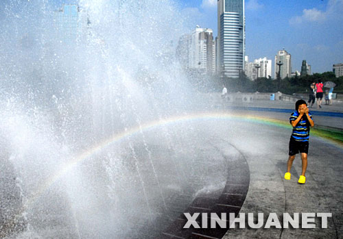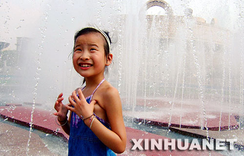 7月24日,一名孩子在上海人民廣場噴水池邊戲水納涼。新華社發(fā)