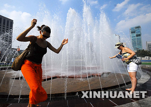 7月24日,兩名外國游客在上海人民廣場噴水池邊戲水納涼。新華社發(fā)