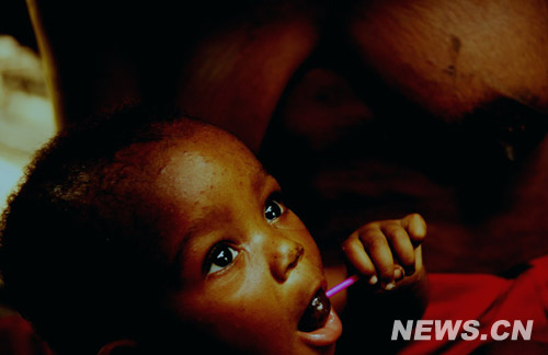 卑格米族兒童在母親懷中吃糖。