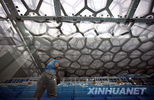 7月27日,保潔人員在國家游泳中心(“水立方”)擦拭看臺座椅。當(dāng)日,國家游泳中心正式向各國運動員開放。