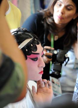 7月26日,記者拍攝中國(guó)國(guó)家京劇院演員后臺(tái)化妝。當(dāng)日,部分境內(nèi)外奧運(yùn)記者采訪了中國(guó)國(guó)家京劇院,直接感受中國(guó)傳統(tǒng)文化。