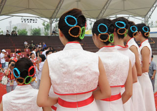 這是7月27日在北京奧運(yùn)會(huì)奧運(yùn)村開村儀式上拍攝的禮儀小姐的五環(huán)頭飾。當(dāng)日,2008年北京奧運(yùn)會(huì)奧運(yùn)村正式開村。