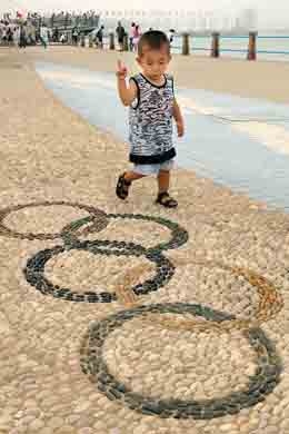 目前,青島處處充滿奧運(yùn)氣息,廣大市民切身感受到了奧運(yùn)就在自己身邊。健身步行道地面上的五環(huán)圖案引起了這位兒童的興趣。