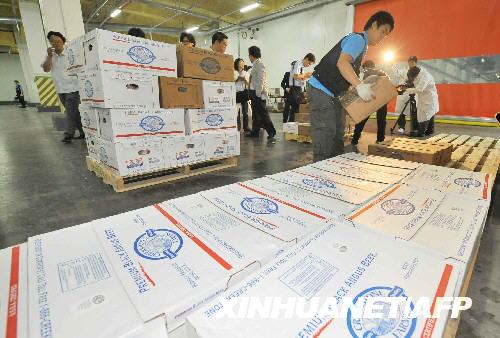 7月29日,韓國(guó)工作人員在京畿道利川的一個(gè)倉(cāng)庫(kù)搬運(yùn)進(jìn)口的美國(guó)帶骨牛肉。一批約1.5噸重的美國(guó)帶骨牛肉當(dāng)日凌晨空運(yùn)至韓國(guó)仁川機(jī)場(chǎng)。這是自2003年末韓國(guó)因美國(guó)暴發(fā)瘋牛病疫情而禁止進(jìn)口美國(guó)牛肉以來(lái),韓國(guó)首次進(jìn)口美國(guó)帶骨牛肉。