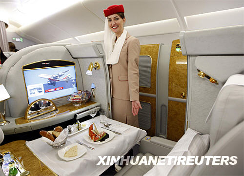 8月1日,在美國(guó)紐約肯尼迪國(guó)際機(jī)場(chǎng),阿聯(lián)酋航空公司的空姐展示首航后的空中客車A380客機(jī)頭等艙。新華社/路透