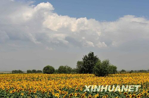 成片向日葵形成了金色海洋(8月2日攝)。近日,寧夏銀川市郊區(qū)成片的向日葵競相綻放,吸引勤勞的蜂蝶飛舞其中,形成一幅美妙的夏日風(fēng)景畫。