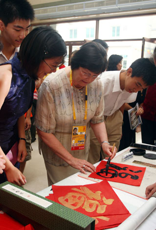 8月7日,國際奧委會主席羅格的夫人安妮·羅格女士(中)在北京四中參觀時親筆寫下“!弊帧
