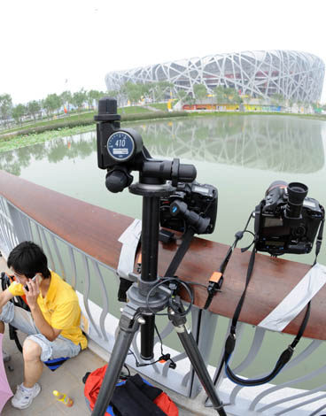 8月8日13時(shí)許,一名攝影師在國(guó)家體育場(chǎng)——“鳥(niǎo)巢”邊架起相機(jī)等待拍攝開(kāi)幕式上燃放的煙花。此刻距北京奧運(yùn)會(huì)開(kāi)幕還有不到7個(gè)小時(shí)。