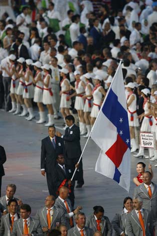 8月8日晚8時(shí),第29屆夏季奧林匹克運(yùn)動(dòng)會(huì)在國(guó)家體育場(chǎng)——“鳥(niǎo)巢”隆重開(kāi)幕。這是荷屬安的列斯代表團(tuán)在開(kāi)幕式上入場(chǎng)。