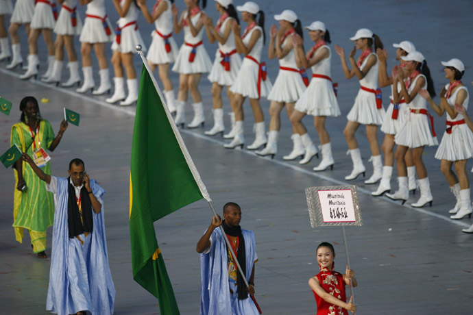 8月8日晚8時,第29屆夏季奧林匹克運動會在國家體育場——“鳥巢”隆重開幕。這是毛里塔尼亞代表團在開幕式上入場。