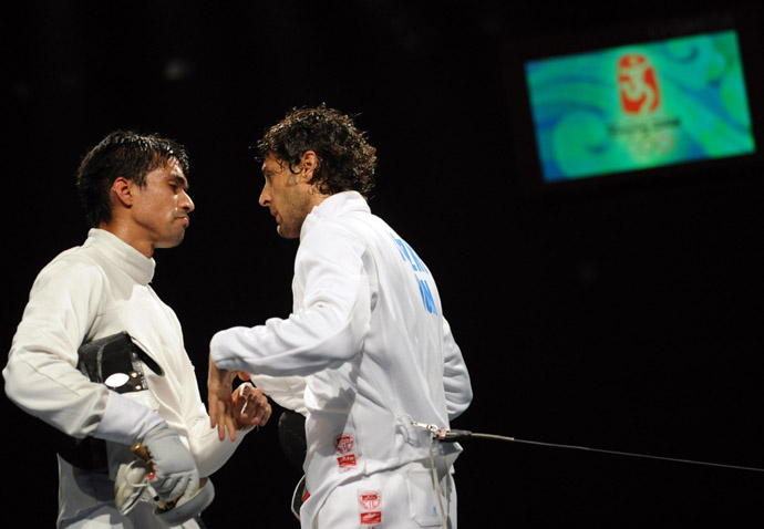 8月10日,委內(nèi)瑞拉選手西爾維奧·費爾南德斯(左)在賽后與匈牙利選手博茨科·加博爾握手。當日,在北京奧運會擊劍男子重劍個人1/8決賽中,此前排名世界第一的委內(nèi)瑞拉選手西爾維奧·費爾南德斯負于匈牙利選手博茨科·加博爾,無緣八強。