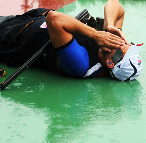 8月10日,捷克選手科斯特萊茨基奪冠后,躺在雨中慶祝勝利。當日,在北京射擊場舉行的北京奧運會射擊男子飛碟多向決賽中,科斯特萊茨基奪冠。