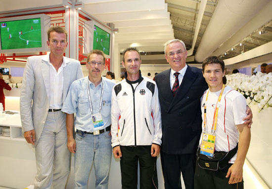 大眾汽車集團董事長文德恩教授與參觀大眾主題館的德國奧運會代表團運動員合影。