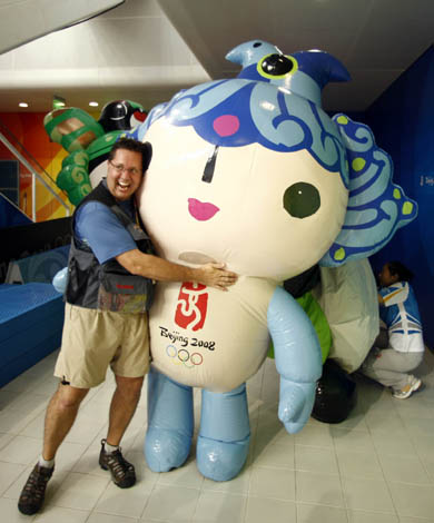 8月11日,一名攝影記者與北京奧運會吉祥物“福娃”中的水娃“貝貝”親密接觸。當日,北京奧運會游泳比賽在國家游泳中心“水立方”繼續(xù)舉行。