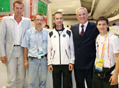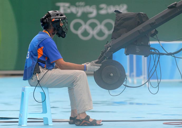 8月11日,在北京奧運會男子曲棍球預(yù)賽的賽場邊,北京奧林匹克轉(zhuǎn)播公司(BOB)的工作人員帶著頭盔,直播曲棍球比賽。由于在曲棍球比賽中,球的飛行路線十分不確定,BOB的工作人員為防止被球砸傷,戴上頭盔工作。