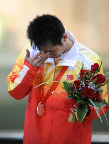 8月11日,中國選手朱啟南在頒獎典禮上擦淚。當(dāng)日,北京奧運會射擊男子10米氣步槍決賽在北京射擊館舉行,中國選手朱啟南以699.7環(huán)的成績獲得亞軍。