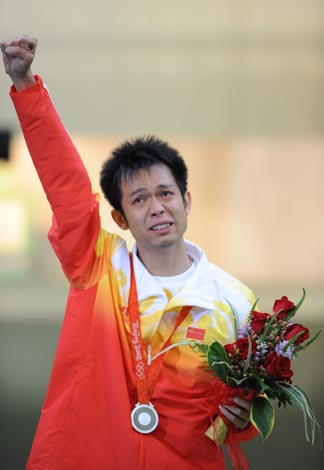 8月11日,中國(guó)選手朱啟南在頒獎(jiǎng)典禮上滿含熱淚。當(dāng)日,北京奧運(yùn)會(huì)射擊男子10米氣步槍決賽在北京射擊館舉行,中國(guó)選手朱啟南以699.7環(huán)的成績(jī)獲得亞軍。