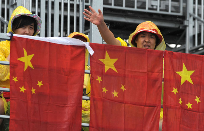 8月11日,觀眾“全副武裝”冒雨在順義水上公園為皮劃艇激流回旋選手加油。