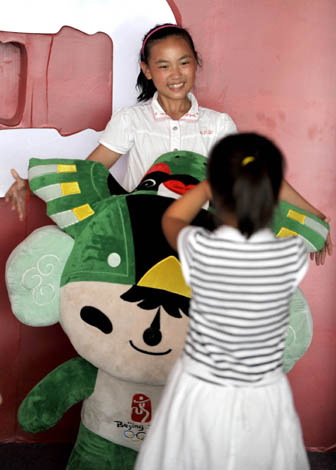 8月11日,一位小朋友在體驗(yàn)區(qū)內(nèi)和“福娃”合影。