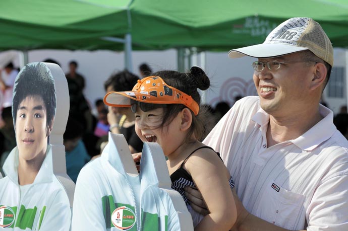 8月11日,一位小朋友在家長(zhǎng)的幫助下與“運(yùn)動(dòng)員”合影。
