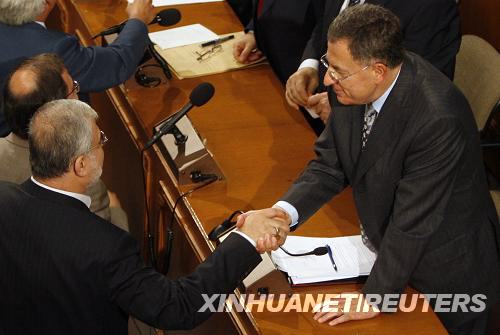 8月12日,在黎巴嫩首都貝魯特召開的國民議會(huì)上,真主黨議員團(tuán)主席穆罕默德·拉德(左)祝賀總理西尼烏拉。黎巴嫩國民議會(huì)在經(jīng)過5天的激烈辯論之后于12日批準(zhǔn)了由總理西尼烏拉領(lǐng)導(dǎo)的黎新一屆政府。根據(jù)5月21日黎對(duì)立兩大派達(dá)成的多哈協(xié)議和黎總統(tǒng)蘇萊曼5月28日的總統(tǒng)令,前總理西尼烏拉于7月11日組成了一個(gè)包括30名成員的新政府,該政府包括了黎巴嫩各黨派的代表。新華社/路透 | |