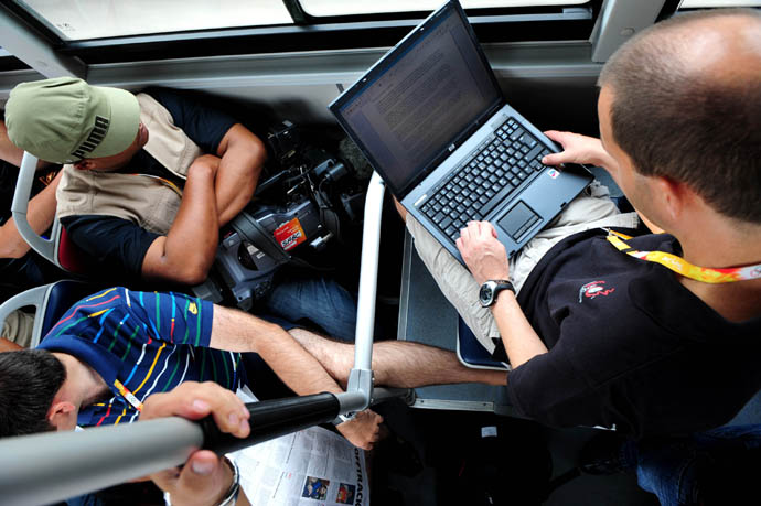 北京奧運(yùn)會正如火如荼地進(jìn)行,參與這項全球媒體大戰(zhàn)的記者們每天都四處奔波采訪、搶發(fā)新聞,穿梭于主新聞中心與各比賽場館之間的媒體班車就成了他們流動的工作間或休息室。